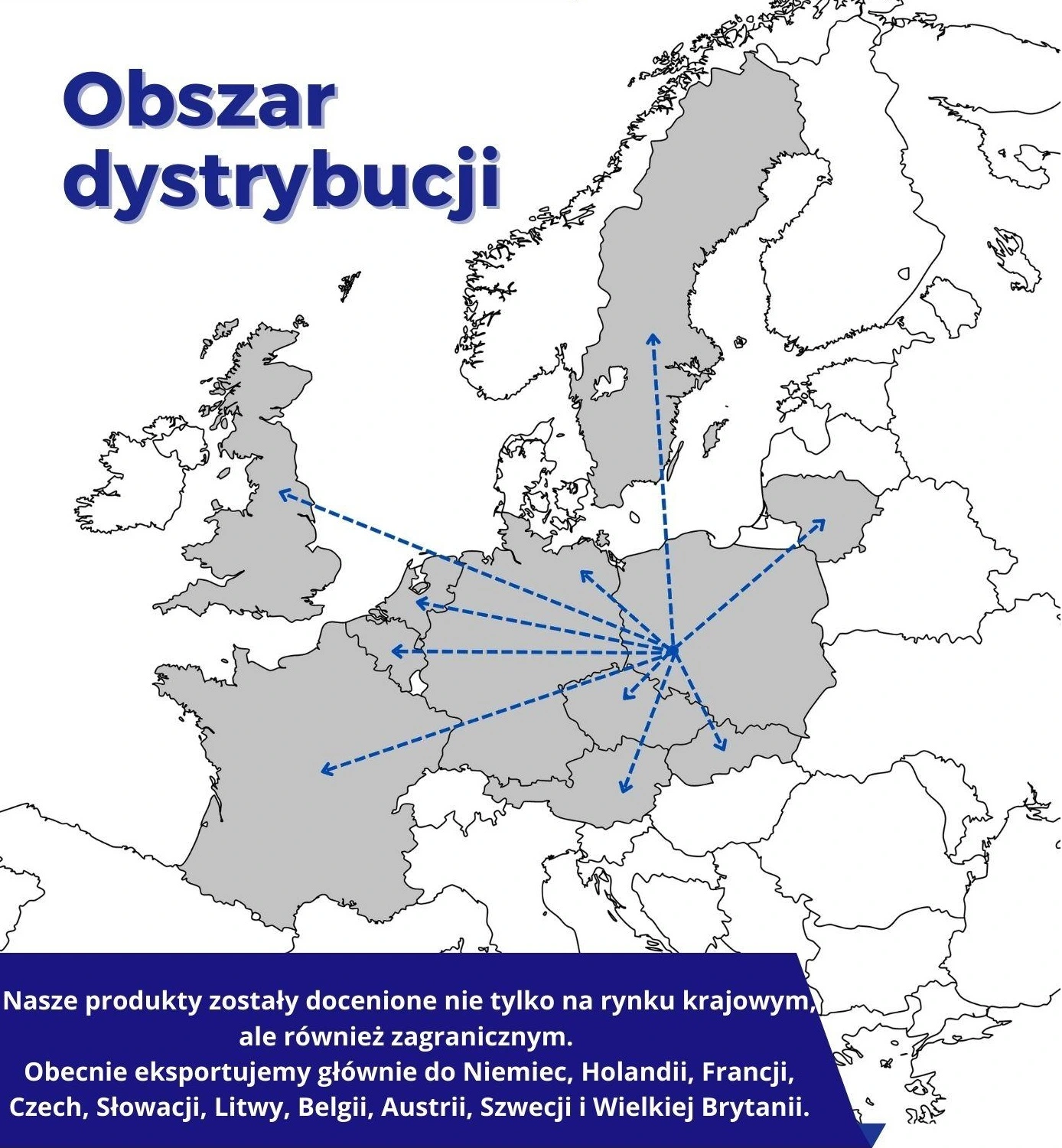 Obecnie eksportujemy nasze produkty głównie do Niemiec, Holandii, Francji, Czech, Słowacji, Litwy, Belgii, Austrii, Szwecji i Wielkiej Brytanii. Każdy z tych rynków wymaga od nas dostosowania się do specyficznych norm i standardów, co tylko potwierdza naszą zdolność do elastycznego i profesjonalnego podejścia do potrzeb klientów.